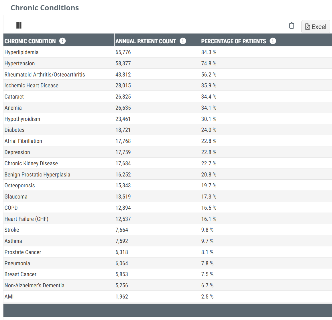 - Chronic Conditions - Breakdown of patients by chronic condition diagnoses