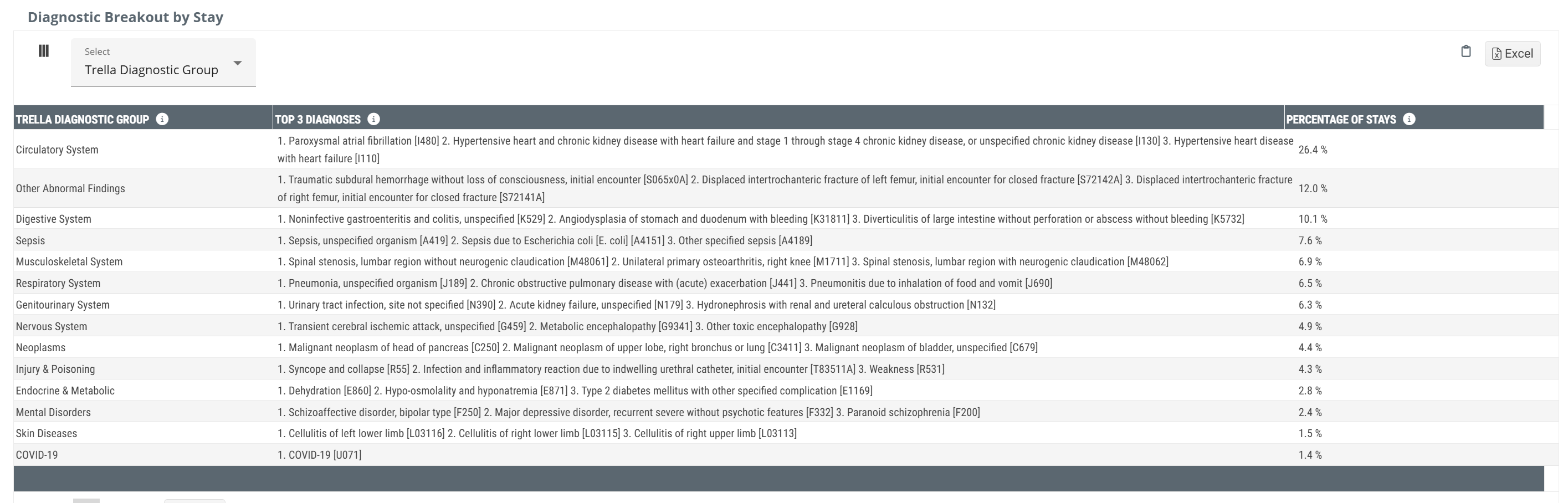 - Diagnostic Breakout by Stay - counts of patient stays by Trella Health Diagnostic Group or MS-DRG for skilled nursing patients discharged from the selected facility.