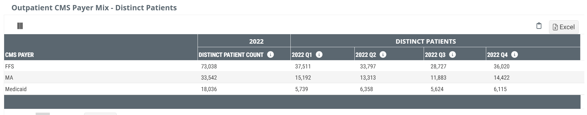 - Outpatient CMS Payer Mix - Distinct Patients - outpatient patient counts for Medicare FFS, Medicare Advantage, and Medicaid discharged from the selected facility