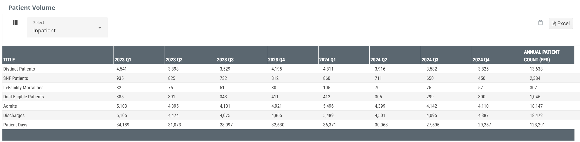 - Inpatient CMS Payer Mix - Distinct Patients - inpatient patient counts for Medicare FFS, Medicare Advantage, and Medicaid discharged from the selected facility
