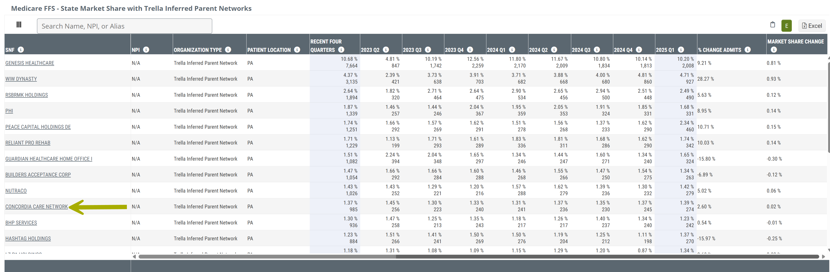 Two metrics Top - This is the percentage of all patients who resided in the listed state/county who were admitted to the skilled nursing facility or Trella inferred parent network named in the row during the year or quarter in the header. In short, this is the market share of skilled nursing patients admitted to the SNF/TIPN in the row. Bottom - This is the count of the patients who resided in the selected county who were admitted to the skilled nursing facility or Trella inferred parent network listed in the row during the year or quarter identified in the header. |