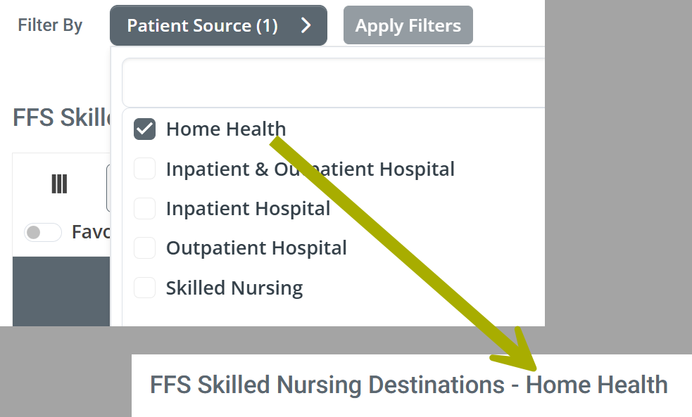 At the top of the Destinations tab Analyze page, above the first table, there is a "Filter By" Patient Source dropdown that allows you to choose the source type (organization) that you want to use for the tables under the Destinations tab. All metrics in the tables under the Destinations tab will reflect patients discharged from the care setting you choose in the dropdown.
