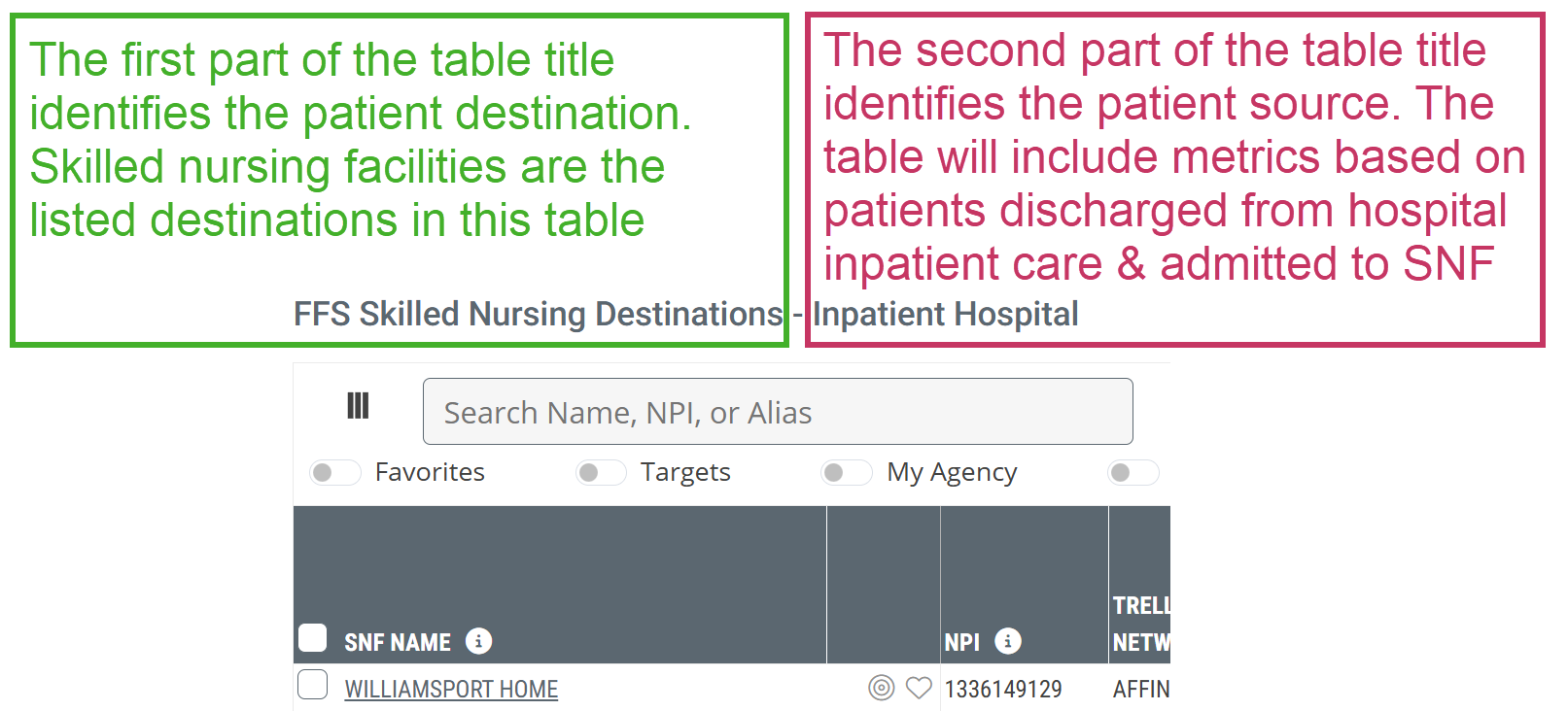 The image above displays the title of the the FFS Skilled Nursing Destinations table. (arrow) The table title will change to show, after the hyphen "-," the organization source type that is currently active on the page. Another example is shown below.