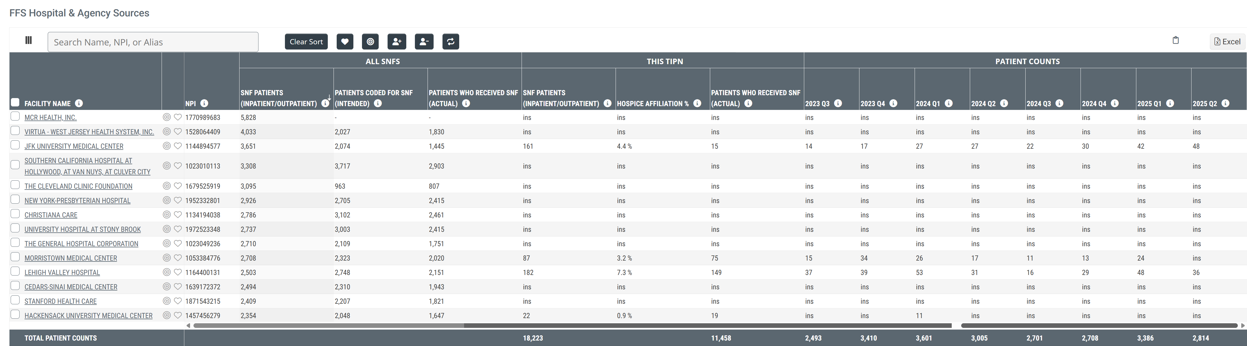 | Patient Counts | 20YY QX | The count of distinct patients discharged from the listed hospital or agency who were admitted to a skilled nursing facility within the selected TIPN during the quarter listed in the header. |
