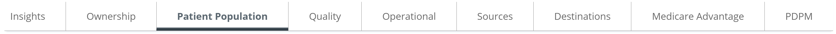 The Patient Population tab of the Physician Analyze Page of the Trella Health Marketscape for Skilled Nursing provides detailed patient demographics for the patients admitted to the selected skilled nursing facility. These metrics are found under the Patient Population Tab.