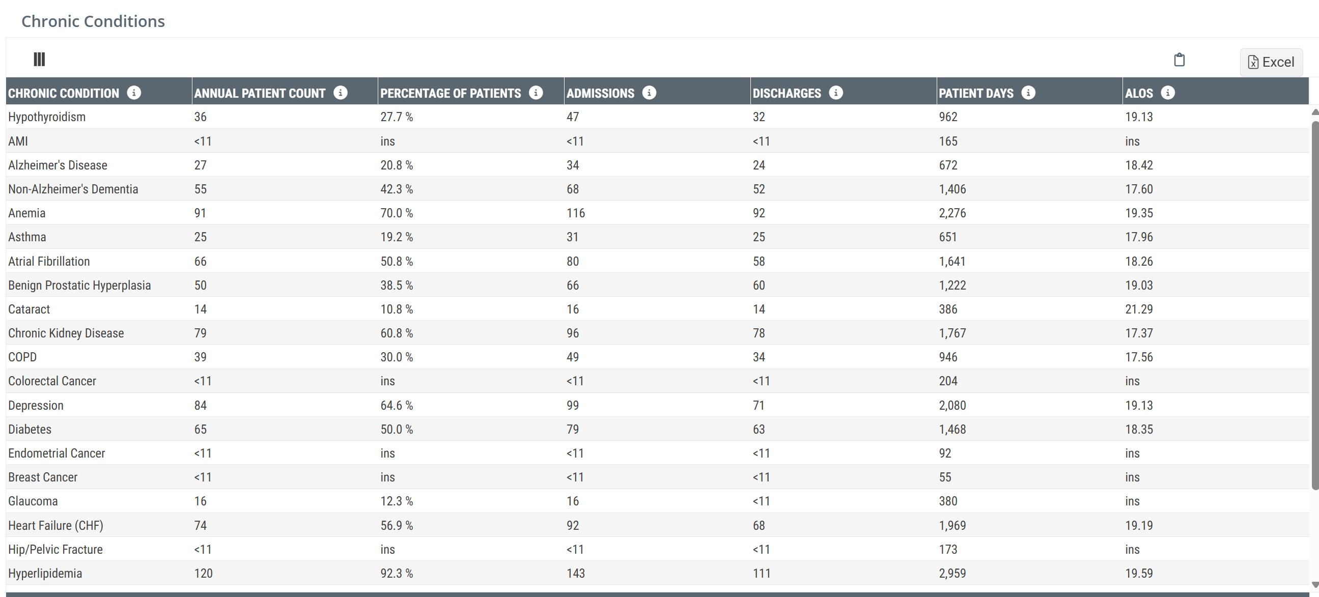 This table contains metrics related to patients treated by the selected skilled nursing facility broken out by chronic conditions.
