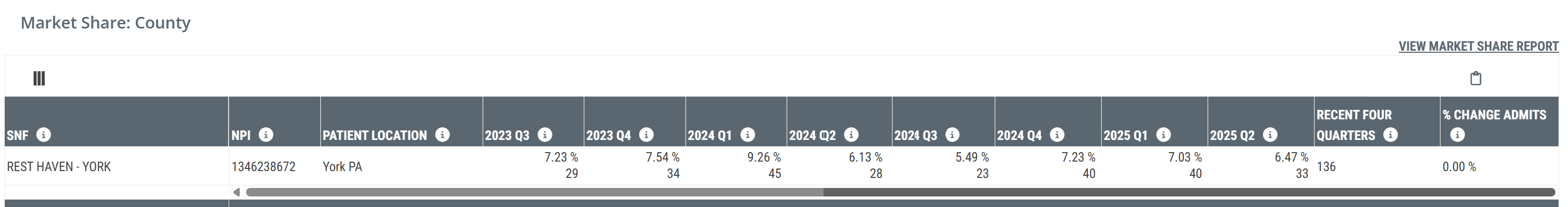 The Market Share: County table contains counts of patients and market share percentages for the selected skilled nursing facility in the county you selected. There are 8 quarters of metrics that allow you to see long range trends.