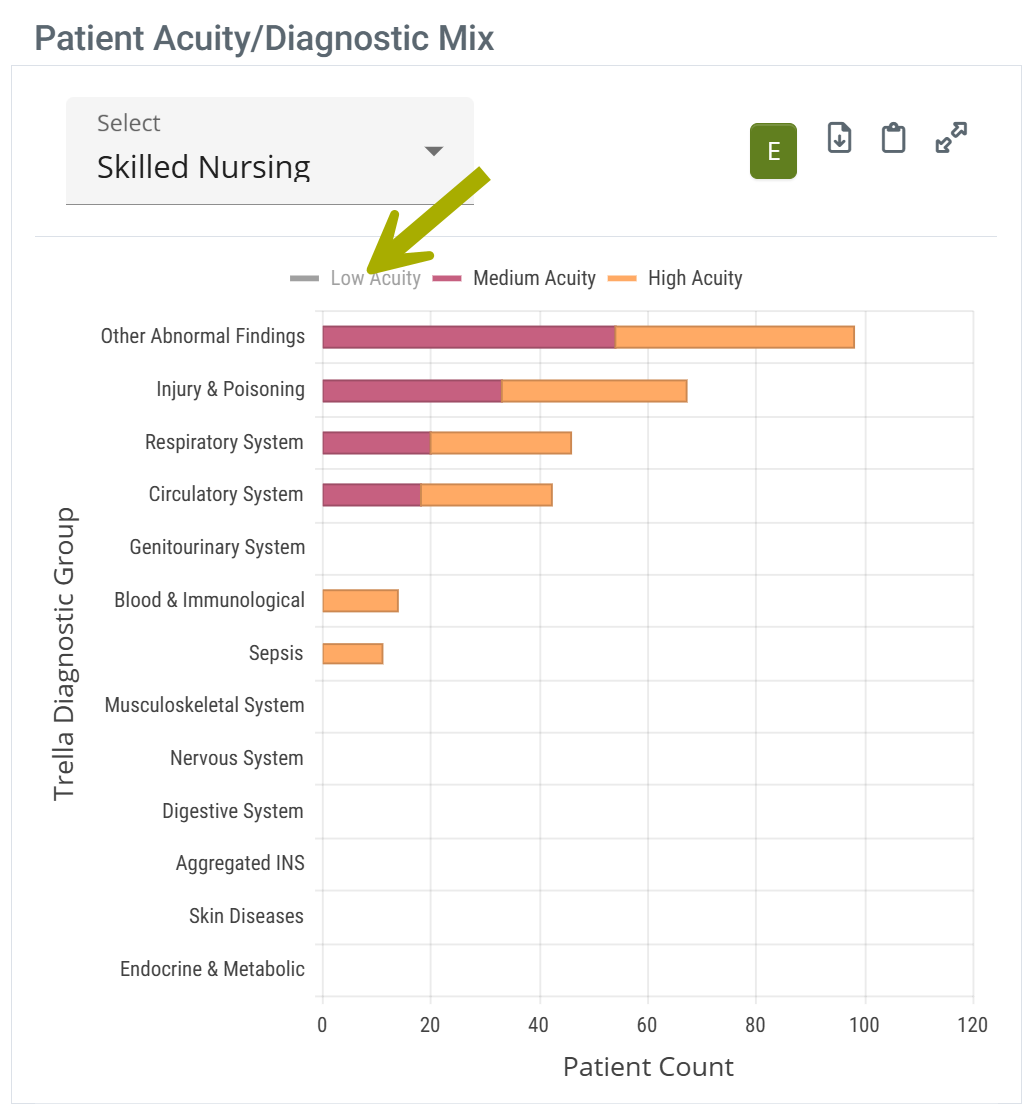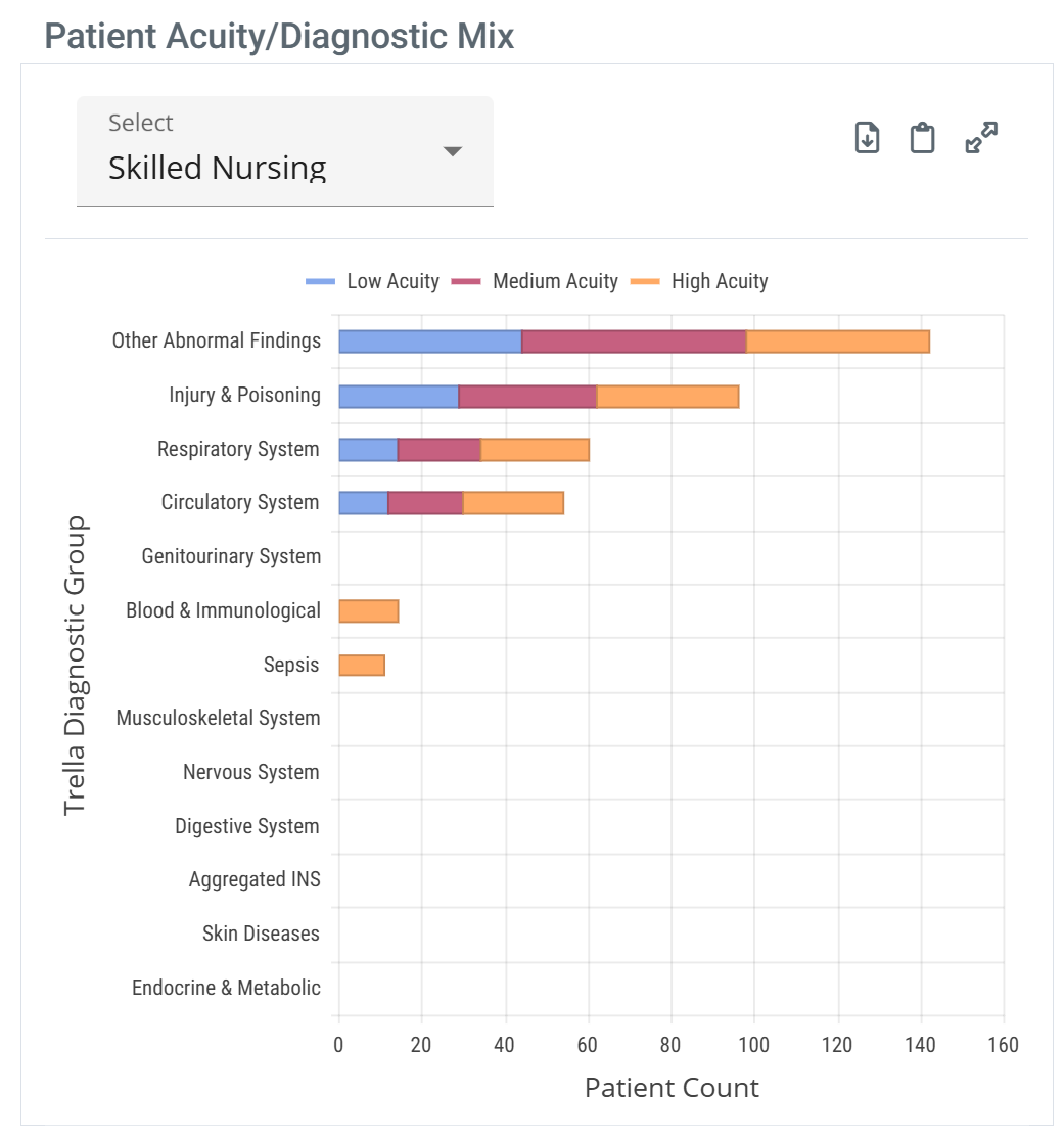 | Medium Acuity | The count of patients evaluated as medium acuity who had a diagnosis on their claim that aligns with the listed Trella Health Diagnostic Grouping. | |