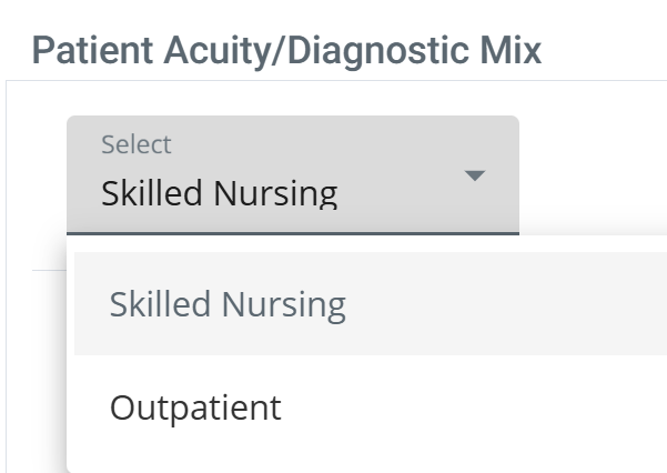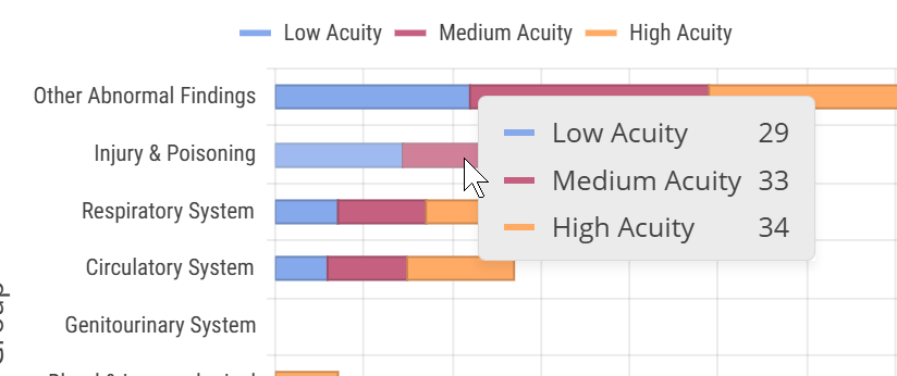 | When you hover over a bar in the Patient Acuity/Diagnostic Mix chart, the metrics for the different patient counts represented in the bar are displayed. | ![]() |