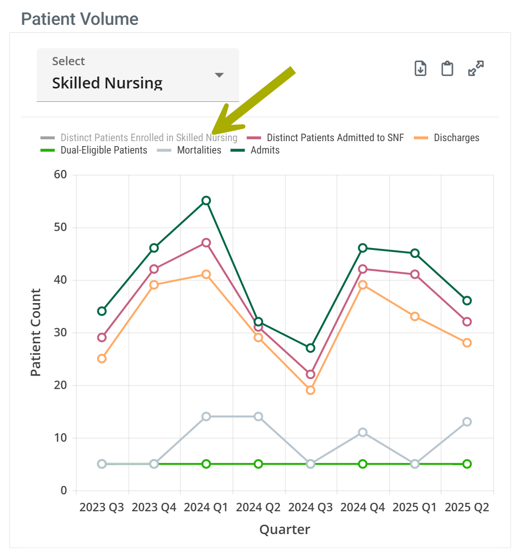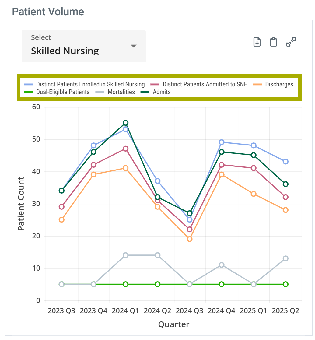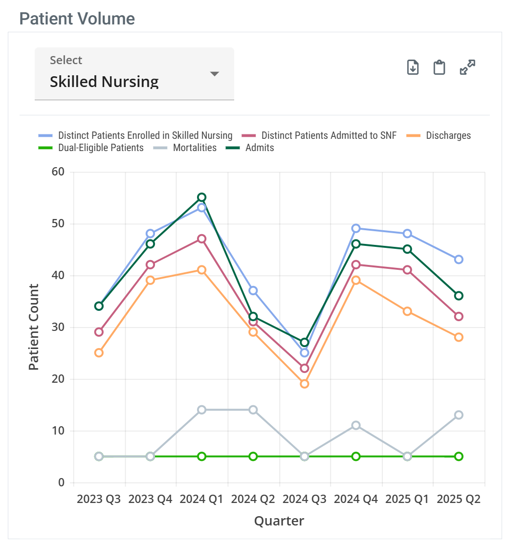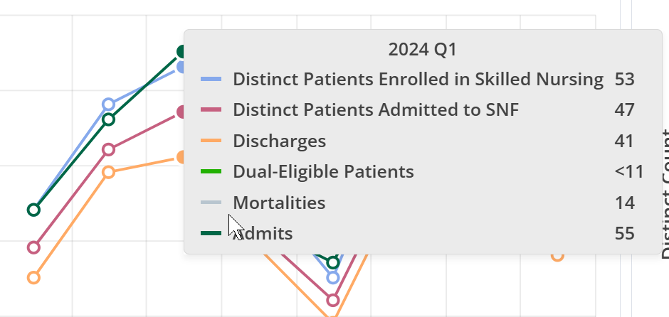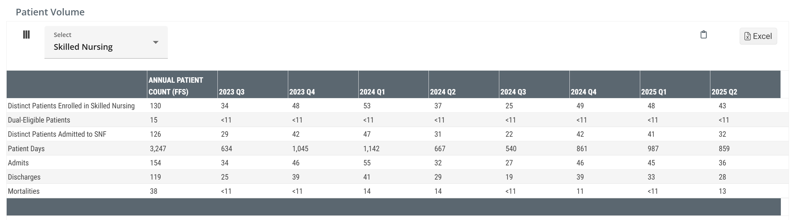 | Distinct Patients Admitted to Skilled Nursing | The count of distinct Medicare FFS patients admitted to the selected skilled nursing facility during the specified period. |