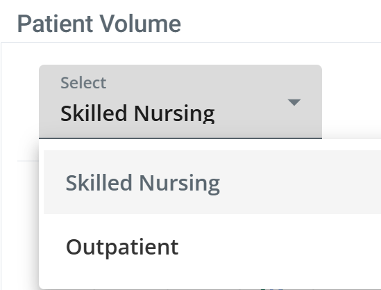 The Patient Volume table shows trended counts of patients admitted to the selected skilled nursing facility.